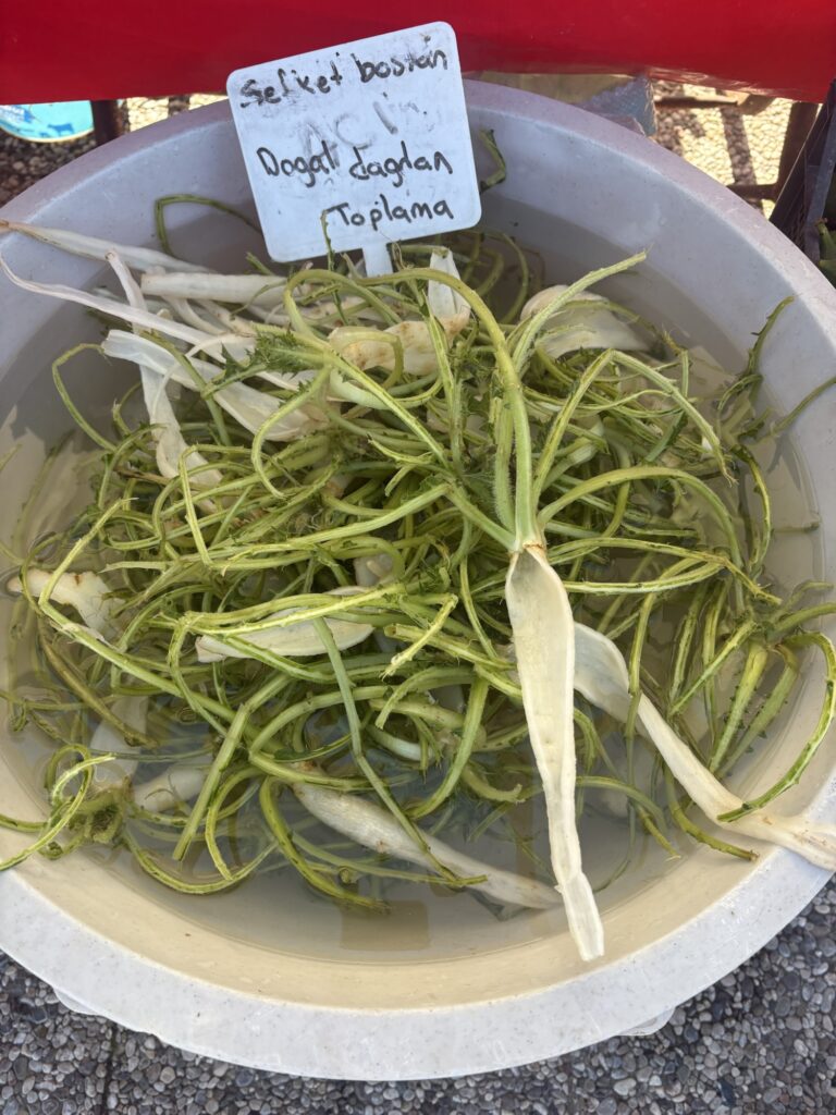 Sur un stand qui vend ces mystérieux légumes, je vois dans une bassine de sorte de racines. les marchands nous expliquent que ce sont des jeunes pousses de chardon et que c’est délicieux avec de la viande d’agneau de l’huile d’olive et des petits oignons et éventuellement des oranges.
